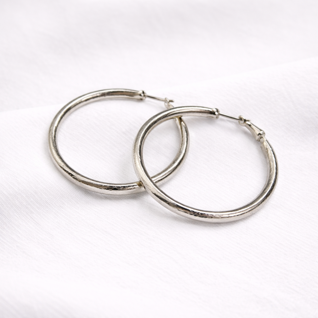These classic silver hoop earrings are a timeless essential for every jewelry collection. Designed with a sleek round silhouette and subtle textured finish, they offer a perfect balance of simplicity and style. Ideal for everyday wear or layering with other pieces for a modern look.