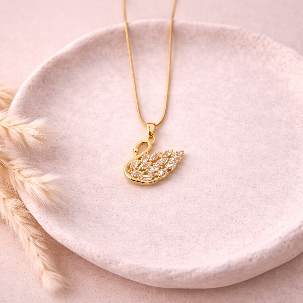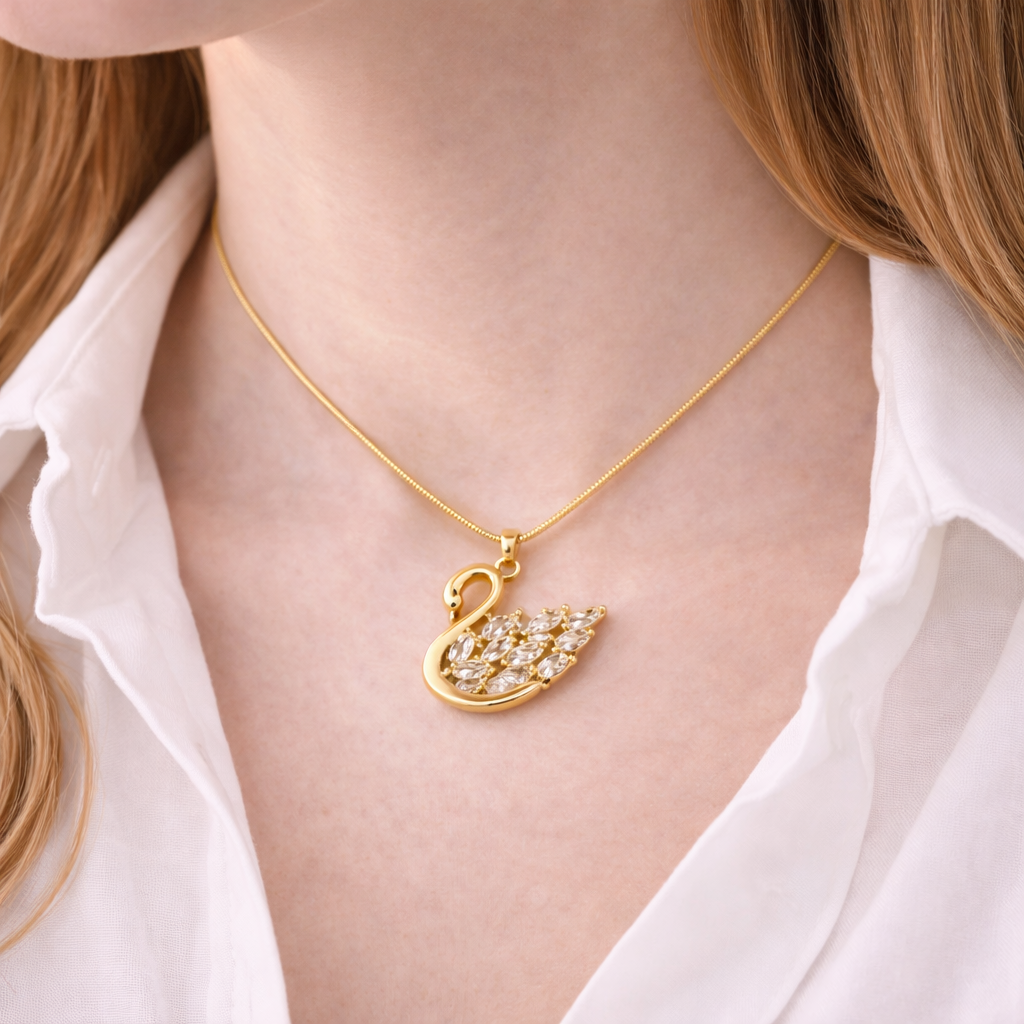 Graceful and sophisticated, this swan pendant necklace symbolizes beauty and elegance. Crafted with a sleek gold outline and adorned with shimmering crystal details on the wing, it creates a delicate yet eye-catching piece perfect for refined styling.