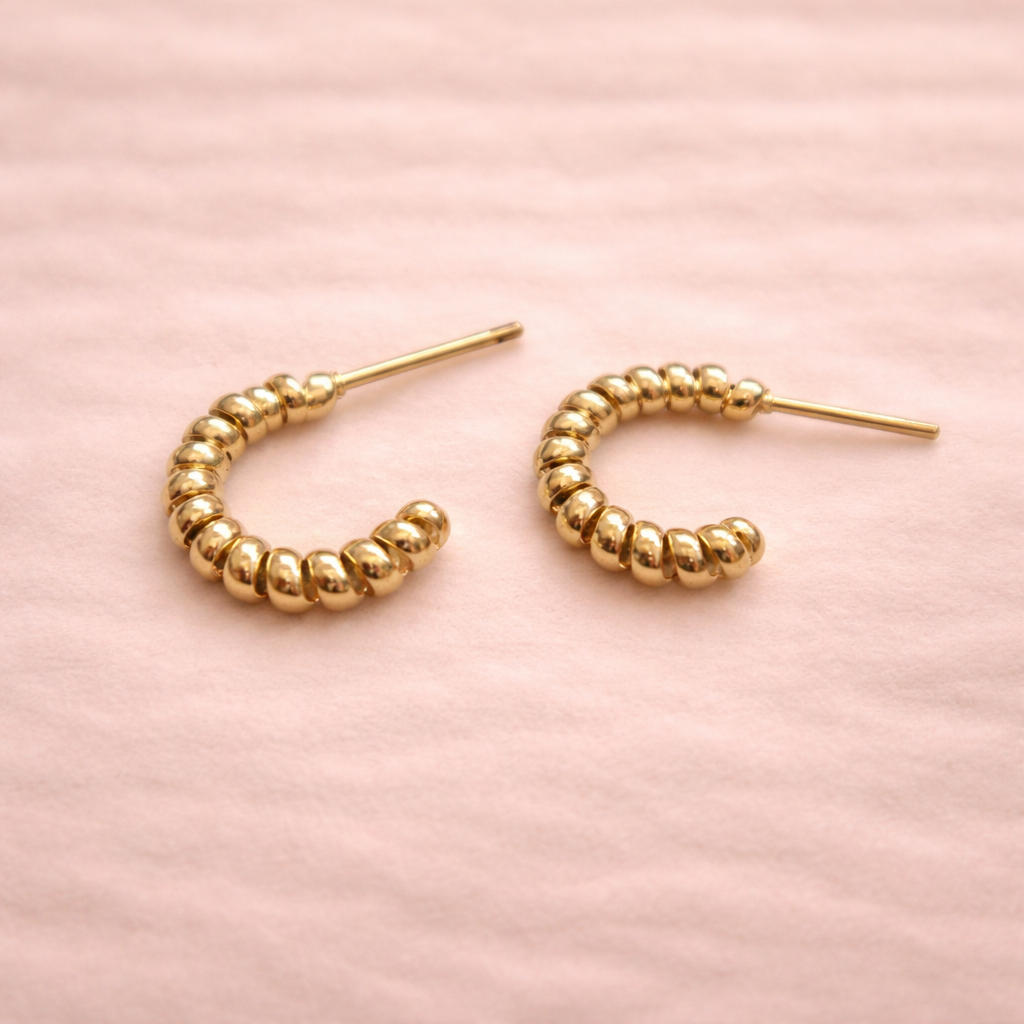 Minimal yet stylish, these gold beaded hoop earrings feature a series of smooth, polished beads arranged along a sleek hoop design. The subtle texture adds dimension while maintaining a clean and modern aesthetic. Perfect for everyday wear, these hoops offer effortless elegance with a touch of detail.