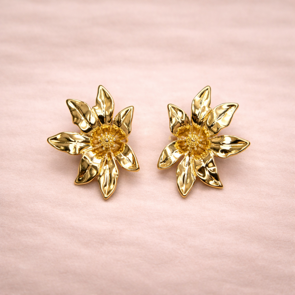 Elegant and expressive, these gold bloom floral stud earrings feature a beautifully sculpted multi-petal design that captures the essence of a blooming flower. The high-polish finish enhances the organic curves, creating a radiant and eye-catching look. Perfect for both everyday elegance and occasion wear, these studs add a sophisticated floral touch to any outfit.