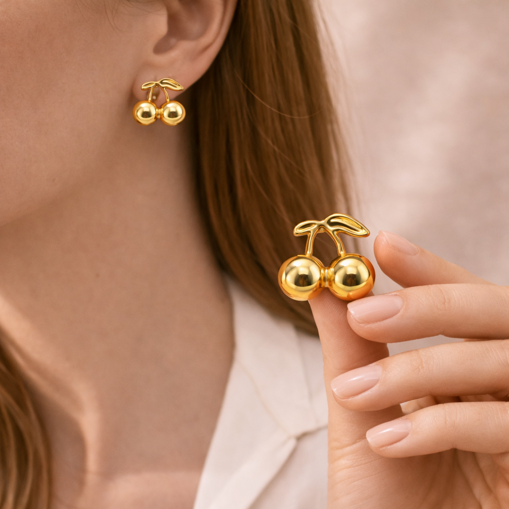 Playful yet elegant, these gold cherry stud earrings bring a fresh and charming touch to your jewelry collection. Designed with two polished spheres and delicate leaf detailing, they create a fun, minimal statement while maintaining a refined look. Perfect for adding a hint of personality to your everyday style or gifting someone special.