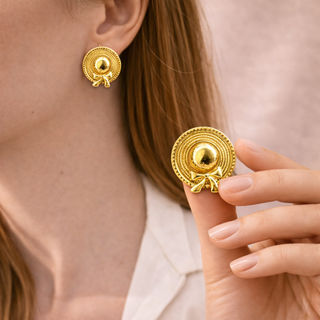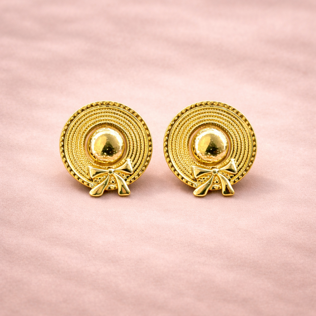 Elegant with a playful twist, these gold coin bow stud earrings feature a beautifully detailed circular design paired with a delicate bow accent. The textured concentric pattern adds depth, while the polished center creates a refined shine. Perfect for adding a unique touch to your everyday look or elevating special outfits with subtle charm.