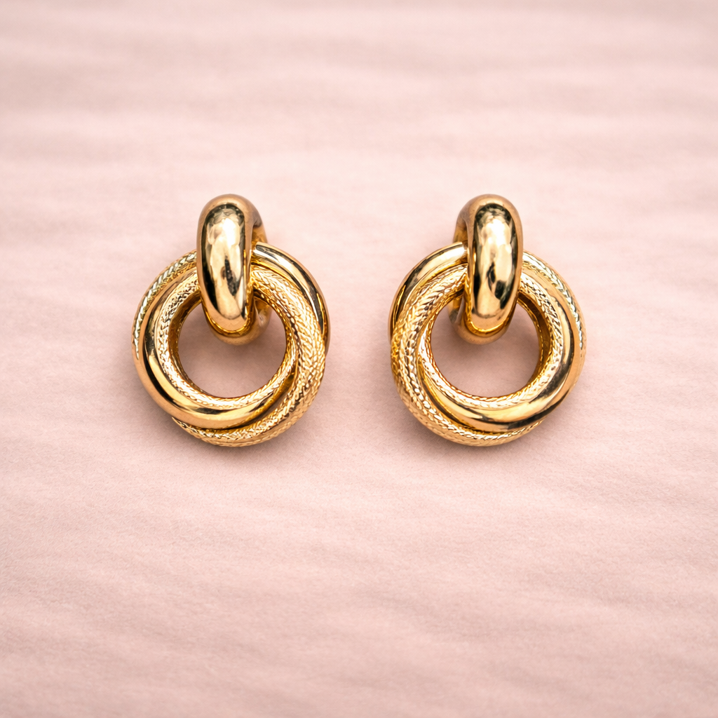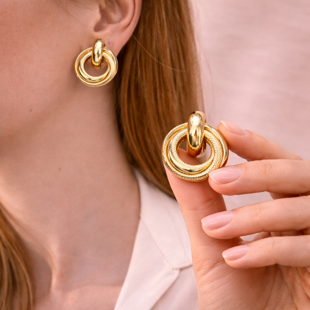 Modern and versatile, these gold interlinked circle drop earrings feature a layered ring design that adds depth and movement to your look. Combining smooth polished surfaces with subtle textured detailing, they create a perfect balance of elegance and statement style. Ideal for both everyday wear and elevated occasions, these earrings bring a refined contemporary touch to any outfit.
