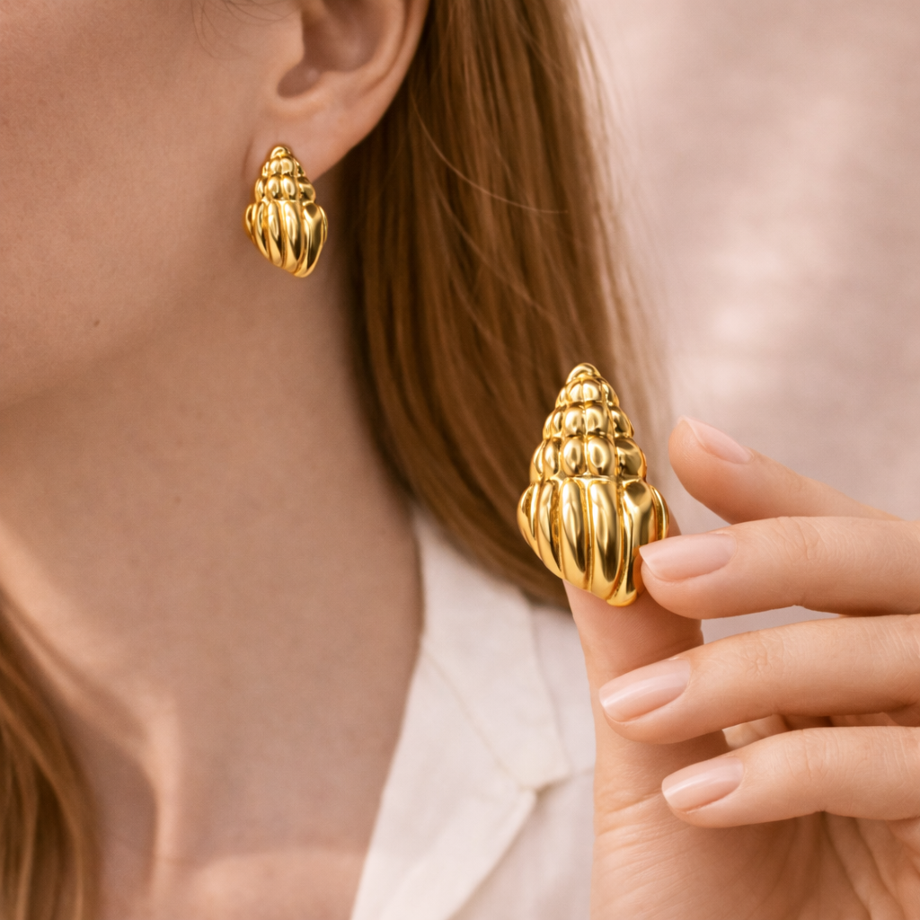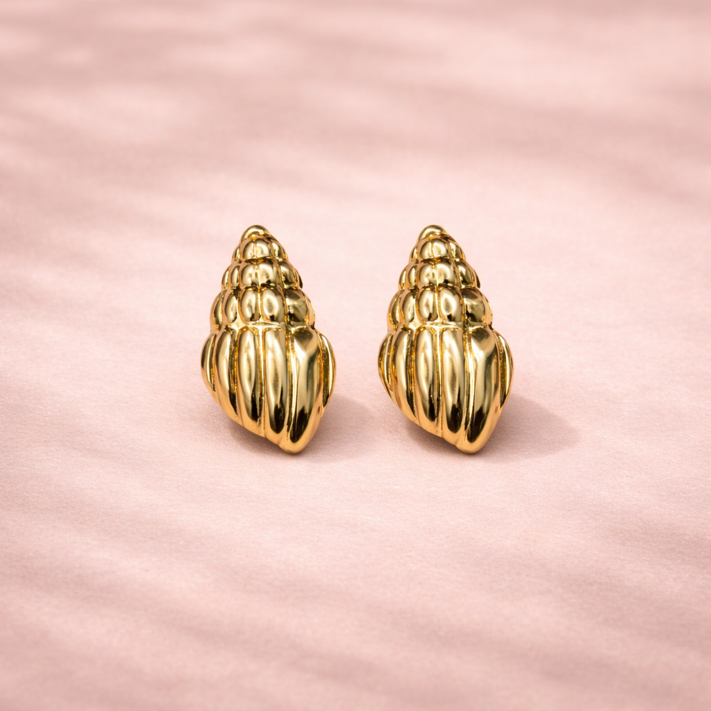Inspired by the beauty of the ocean, these gold shell stud earrings bring a refined coastal charm to your jewelry collection. Designed with a sculpted shell shape and polished gold finish, they offer a perfect blend of elegance and texture. Ideal for everyday wear or vacation styling, these studs add a subtle yet distinctive touch to any outfit.