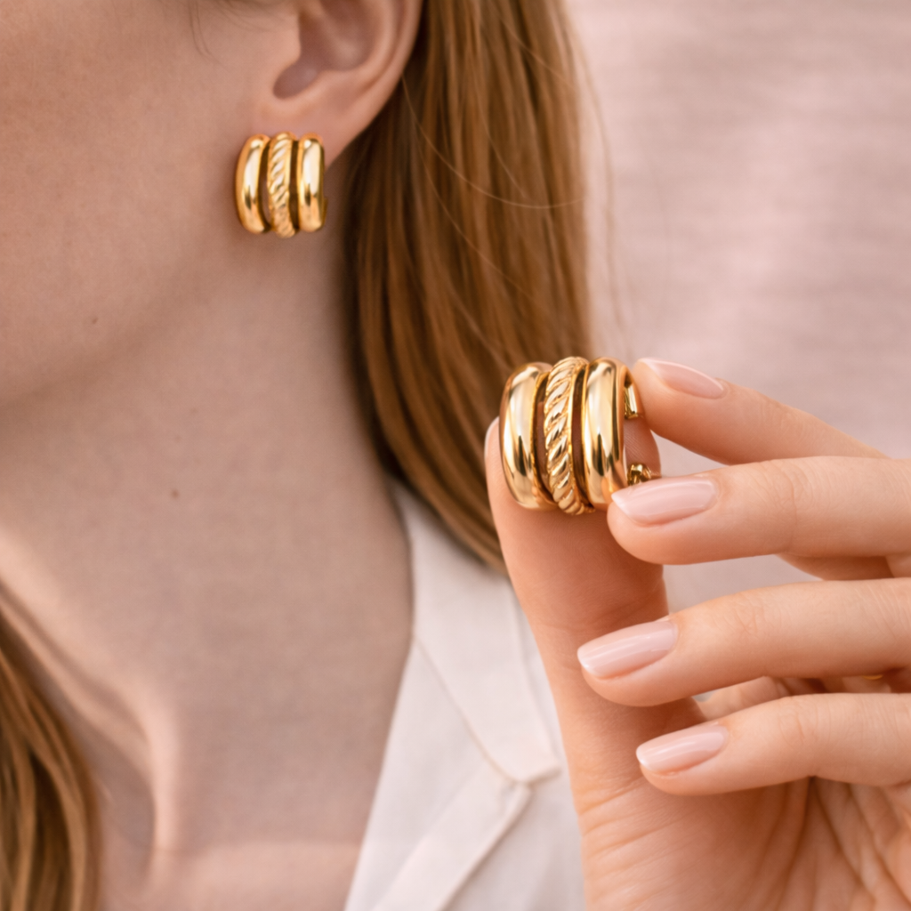 Sleek and modern, these gold triple band hoop earrings feature a layered design that combines smooth polished curves with a textured central band. The structured yet compact silhouette offers a bold look while remaining versatile for everyday wear. Perfect for adding subtle depth and style, these hoops effortlessly elevate any outfit.