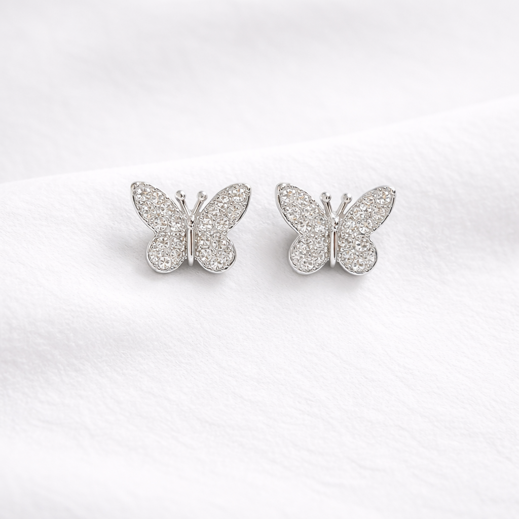 These silver crystal butterfly stud earrings are a delicate blend of elegance and sparkle. Designed with finely detailed wings encrusted with shimmering stones, they bring a graceful and feminine charm to your look. Perfect for everyday wear or special occasions, these studs add a subtle yet eye-catching shine.