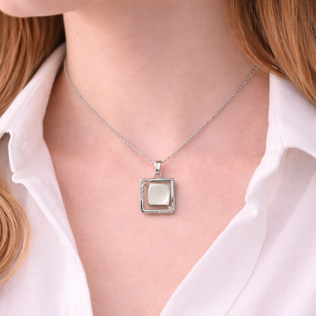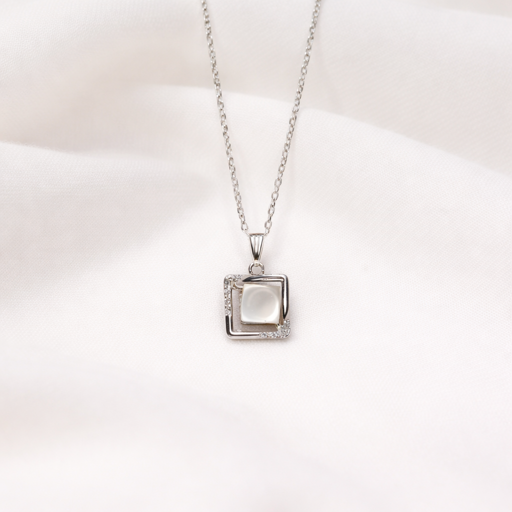 This elegant silver pendant necklace features a modern geometric design with a soft pearl centerpiece. The layered square frame, accented with subtle stone detailing, creates a refined balance between minimalism and sophistication. Perfect for everyday elegance or special occasions, this piece adds a graceful touch to any outfit.