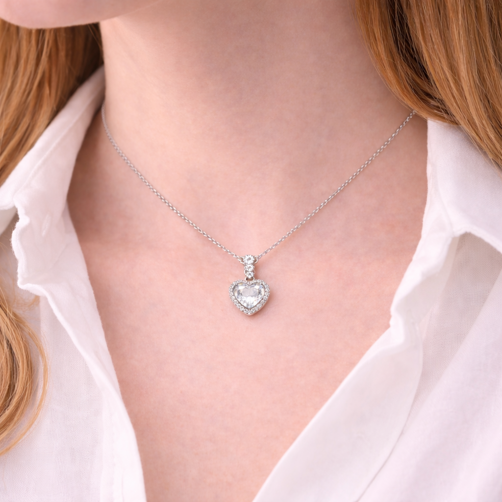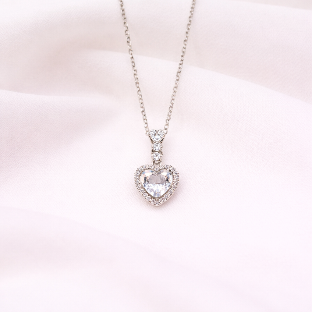 Elegant and timeless, this silver heart pendant necklace features a sparkling crystal centerpiece surrounded by delicate stone accents. The layered heart design adds depth and brilliance, making it a perfect symbol of love and sophistication. Ideal for everyday wear or as a meaningful gift.