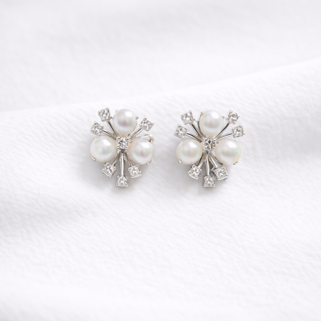 These silver pearl burst stud earrings feature a radiant cluster design that beautifully combines classic pearls with sparkling crystals. Arranged in a starburst pattern, the pearls add softness while the crystals bring a refined shimmer—perfect for elevating both everyday and occasion looks.